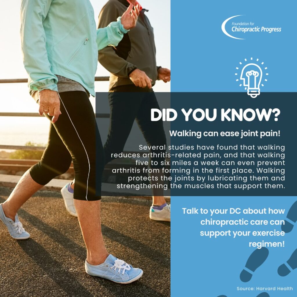 Walking can help to ease joint pain! Studies have shown that walking reduces arthritis-related pain and walking five to six miles a week can prevent arthritis in the first place.